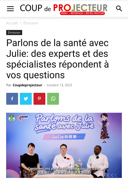 该系列节目围绕几内亚民众需求设计,每期聚焦1个核心健康主题,邀请1名中方和1名几方专家共同出镜,采用中几专家共同探讨的模式,以中法双语解析健康知识,充分保障科普内容符合当地传播习惯。目前,已完成录制包括泌尿结石、腹股沟疝、急性脑梗死等高发疾病的7期科普节目,首期节目《别让小石头惹大麻烦——泌尿结石你了解吗?》已正式登陆几内亚“Coup de projecteur”新闻网站,率先与当地民众见面,为后续系列内容传播奠定良好开局。