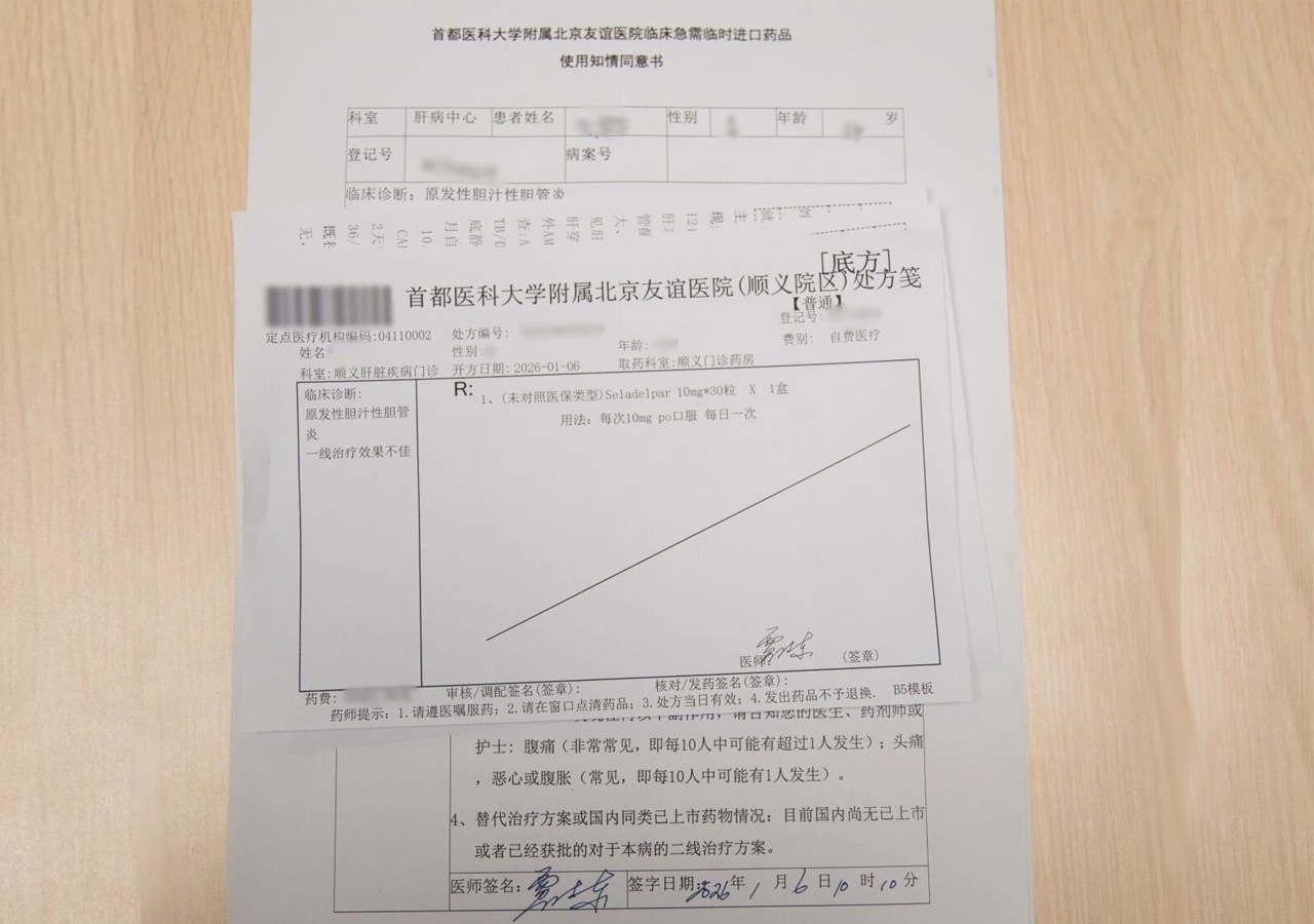 1月6日,在我院肝病中心门诊,经过数次详细的问诊、充分的病情评估后,贾继东主任医师为一位对一线药物应答不佳的原发性胆汁性胆管炎患者开出了有望阻止、延缓疾病进展的药物Seladelpar。这是中国内地开出的首张处方,也是因北京天竺罕见病药物临床急需临时进口政策获益的第一位患者。