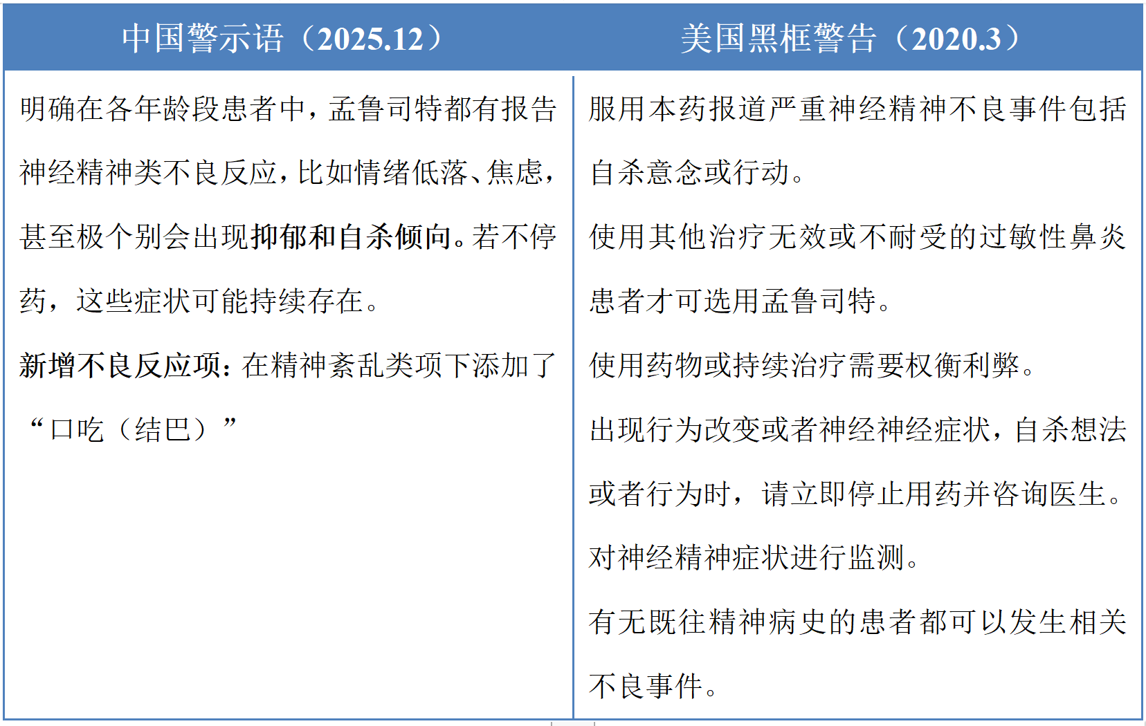 早在2020年3月,美国 FDA(美国食品药品监督管理局)对孟鲁司特钠发布黑框警告,强调医护人员应意识到孟鲁司特钠可能带来严重神经/精神事件风险,包括抑郁、自残、自杀倾向。