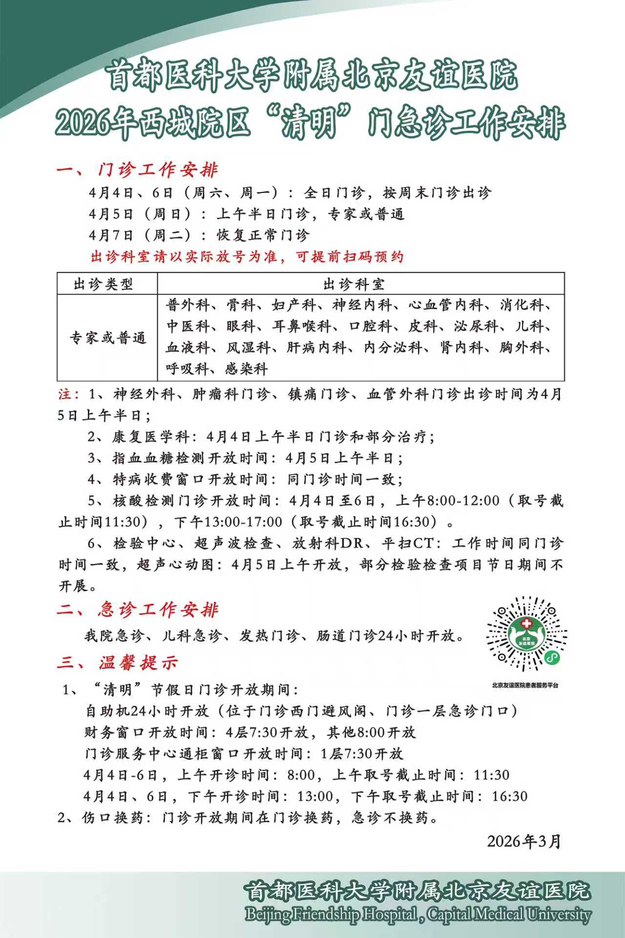下一篇: 首都医科大学附属北京友谊医院通州院区2026年“清明”门急诊工作安排